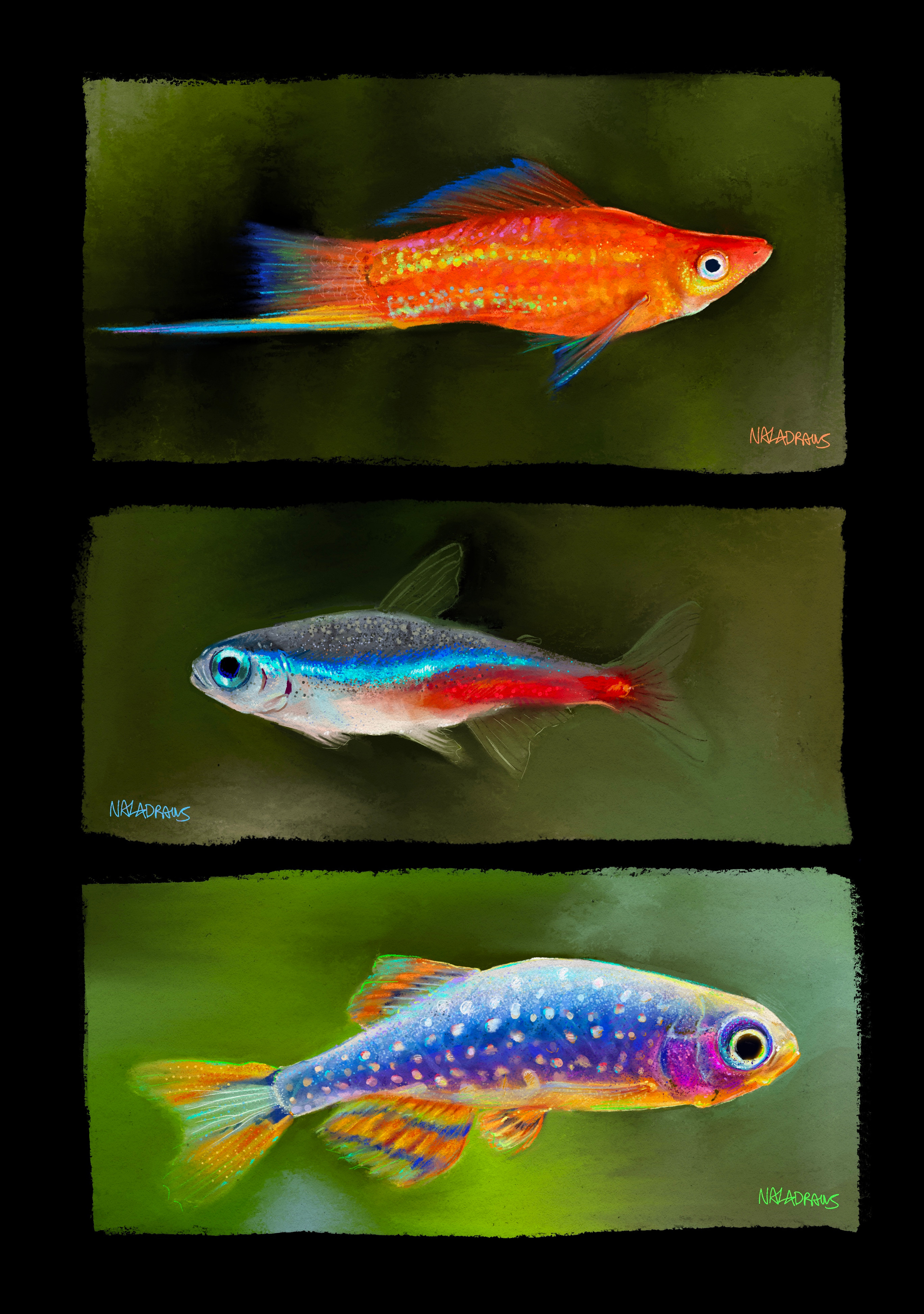 three studies of fish because tiktok told me that painting a fish would help with my art block. all it did was give me motivation to paint two more lol